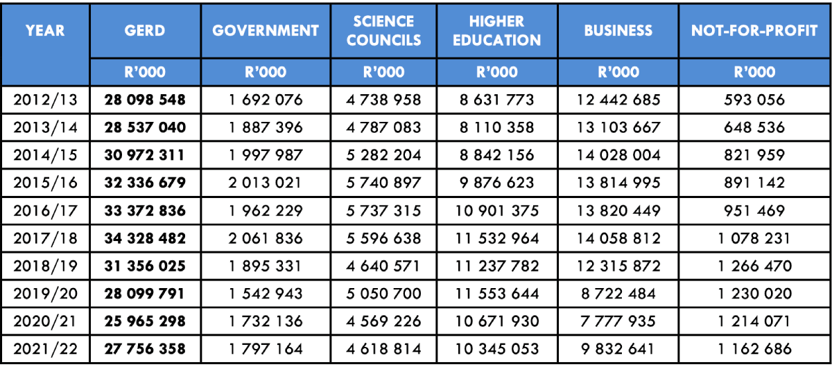 Constant 2015 Rand (R) values 2012-13 to 2021-22. Source: South African National Survey of Research and Experimental Development: Statistical Report 2021-2022